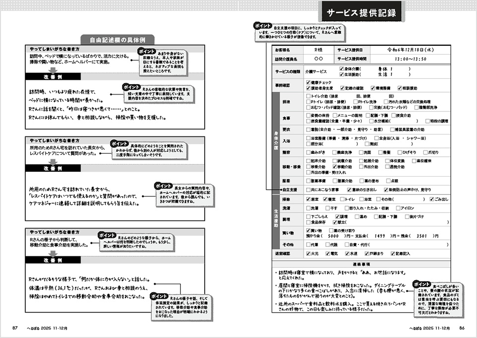 『へるぱる 2025 11・12月』では、他にRさんの「アセスメント表」「訪問介護計画書」「手順書」「モニタリングシート」を取り上げています。他事業所の書類を見る気持ちで読み込んでみてください。