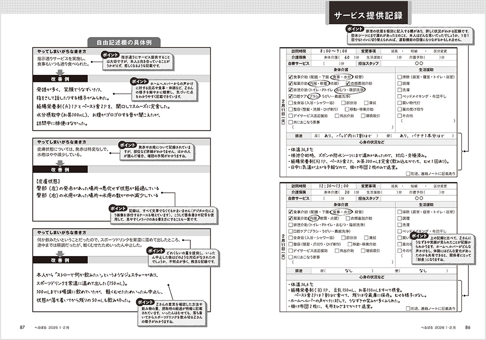 今号ではZさん(86歳)の書類を取り上げます。下に掲載しているのは、サービス提供記録。自由記述欄の記述例は、改善例と共に「やってしまいがちな書き方」を掲載しています。