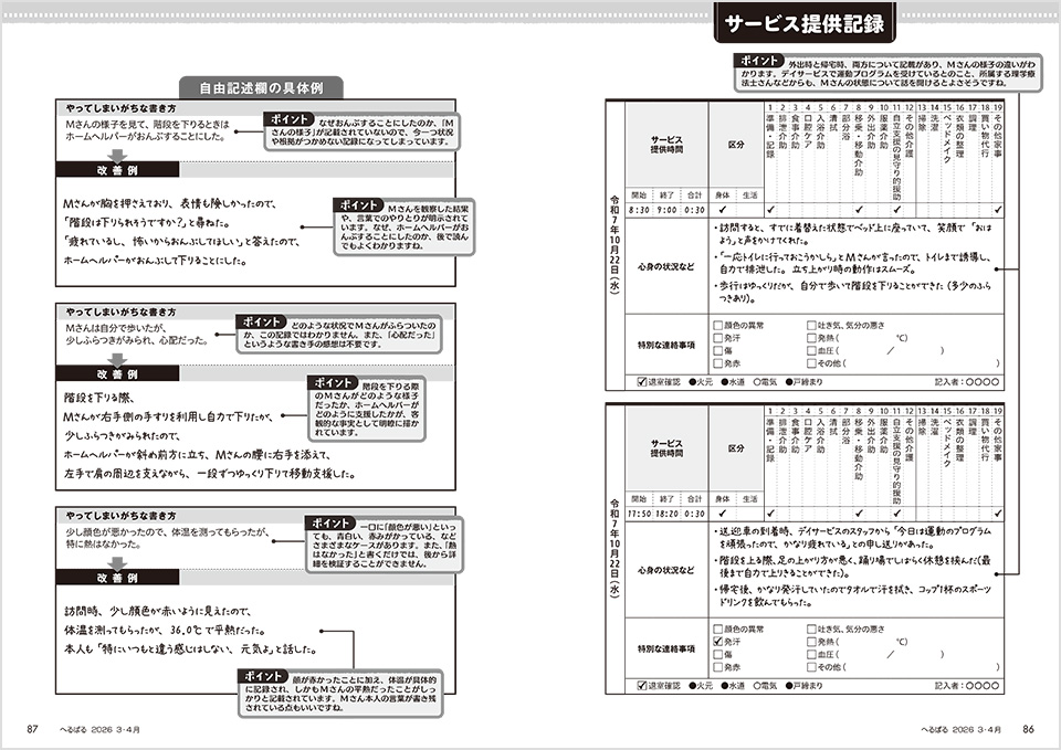 今号ではMさん(99歳)の書類を取り上げます。下に掲載しているのは、サービス提供記録。自由記述欄の記述例は、改善例と共に「やってしまいがちな書き方」を掲載しています。