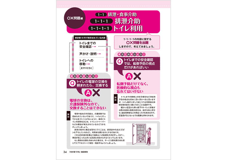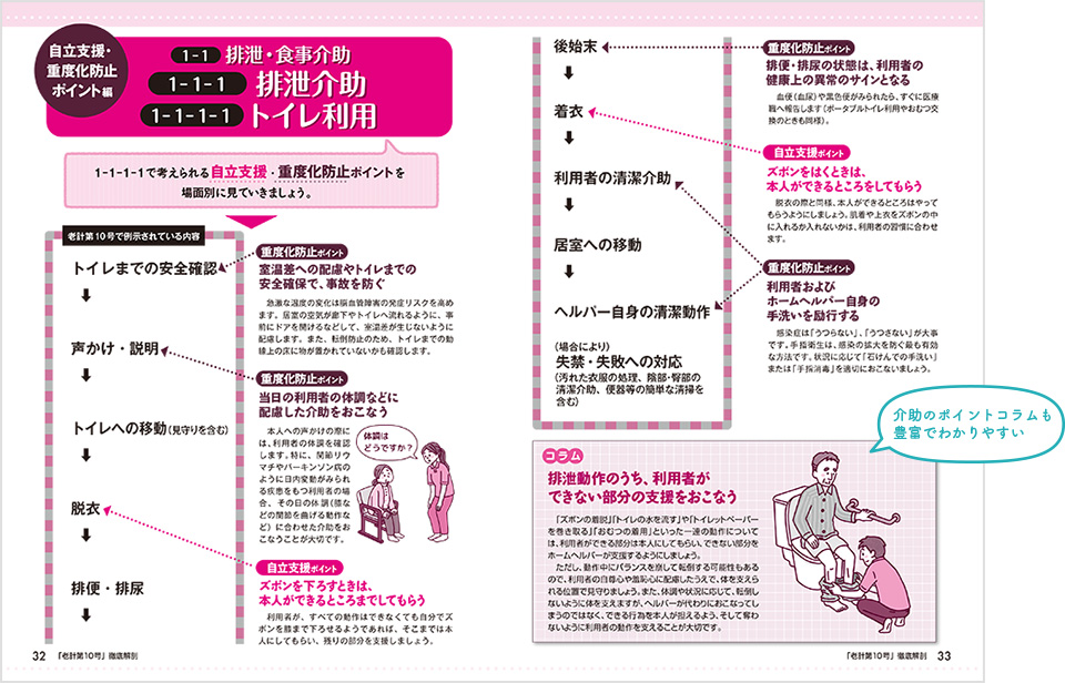本書では、自立支援・重度化防止ポイント編 で読み込んでから、〇×問題編で理解を深め、と、全文を二回読むので自然に理解が深まり、現場で悩んでしまうときの判断の確かな根拠が身につきます。また、書きおろしnewポイントとして「住宅型有料老人ホーム等における訪問介護」での支援ポイントを事例に沿って解説します。